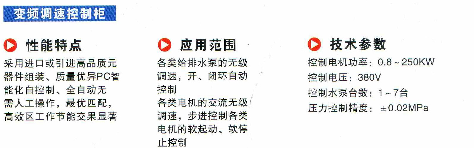 公司主要供應消防泵、管道離心泵、排污泵、多級泵、自吸泵、G型單螺桿泵、ZW增壓穩壓設備、成套給水設備、控制柜等系列產品。